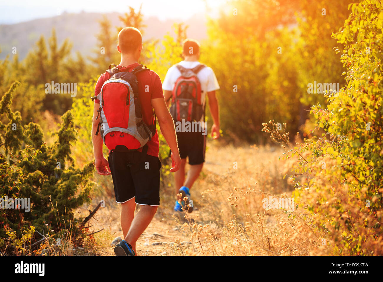 Two backpackers hiking through the forest Stock Photo - Alamy