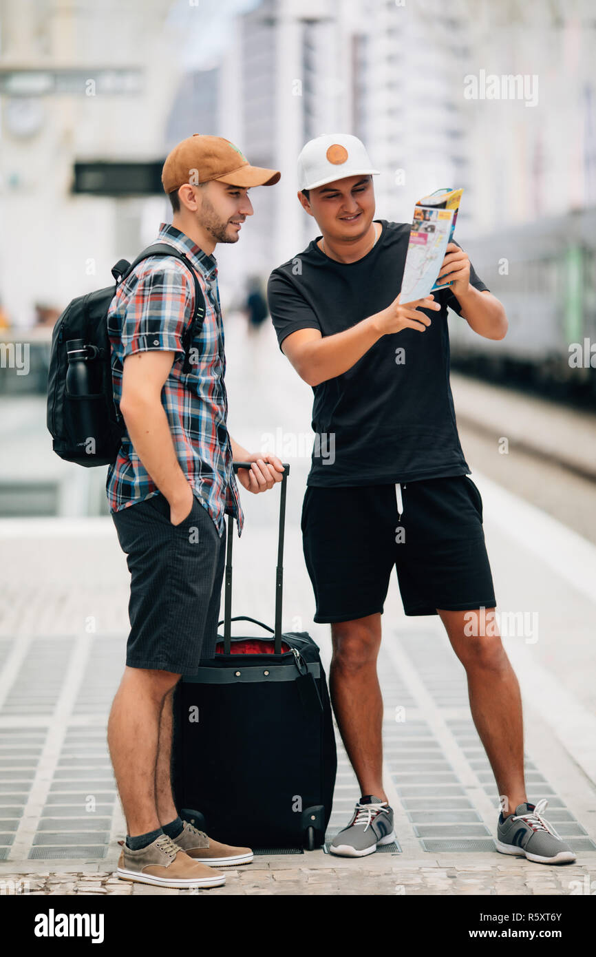 Two backpackers look at a map at train station Stock Photo - Alamy