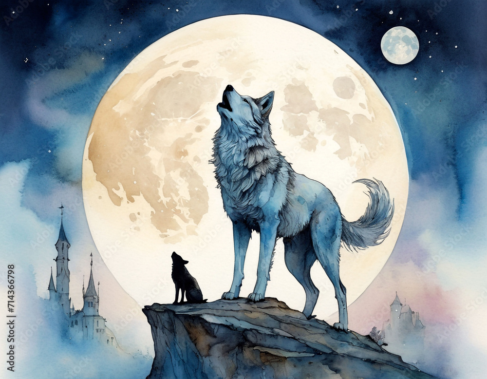 Two wolves howling, full moon, starry night sky. Watercolor story book ...