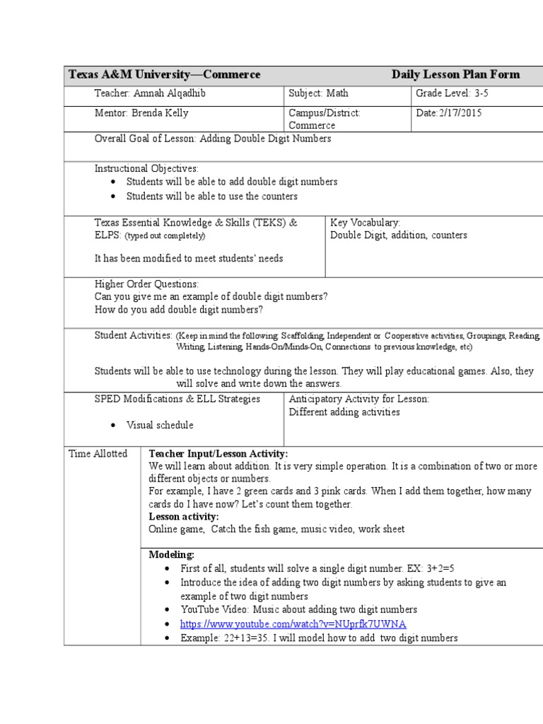 Double Digit Addition Lesson Plan | PDF | Lesson Plan | Education Theory