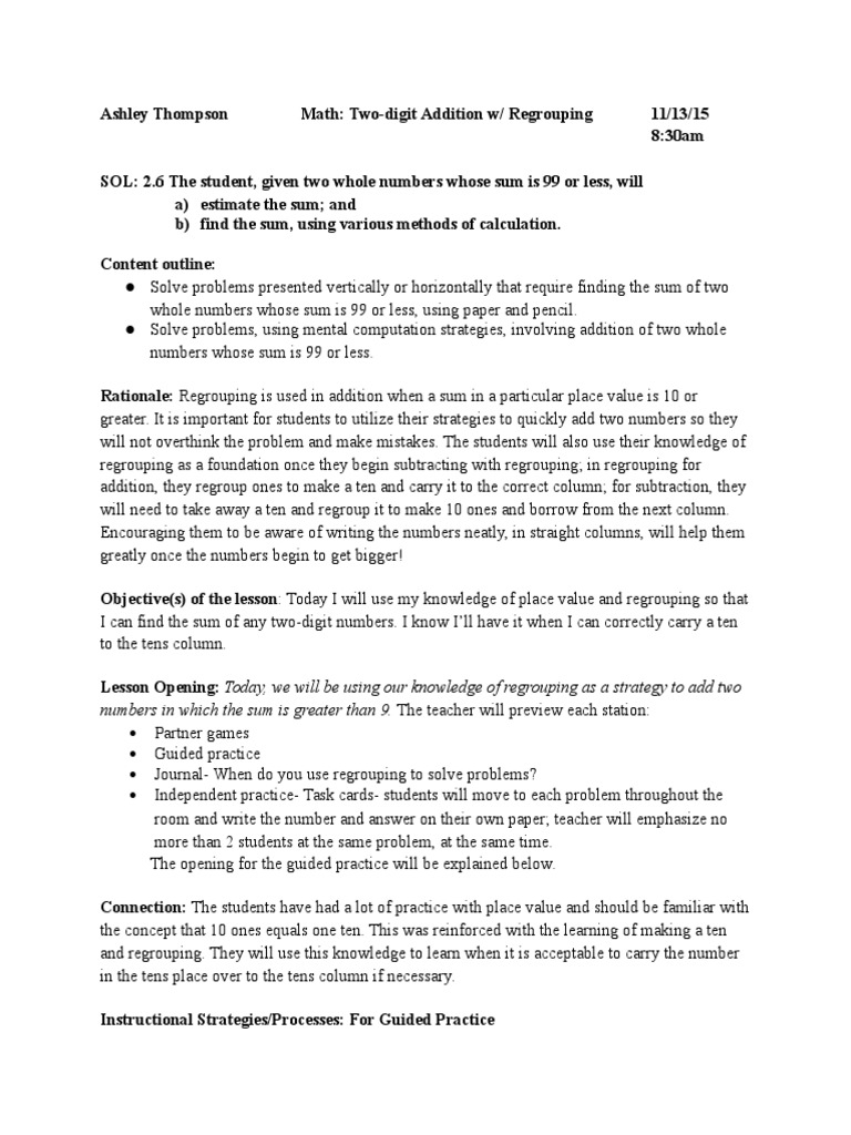 Educ 420 Lesson Plan 3 Two-Digit Addition With Regrouping | PDF ...