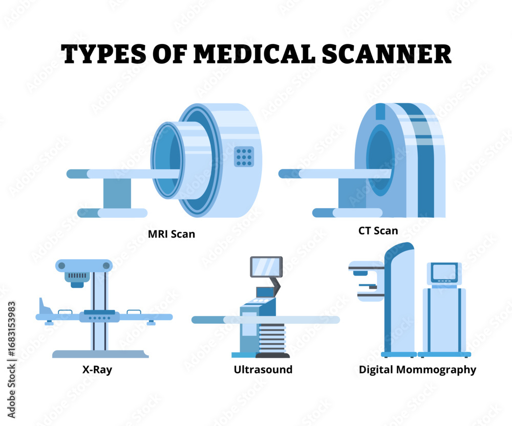 Different types of medical scanner types. Labeled MRI Scan, CT Scan, X ...