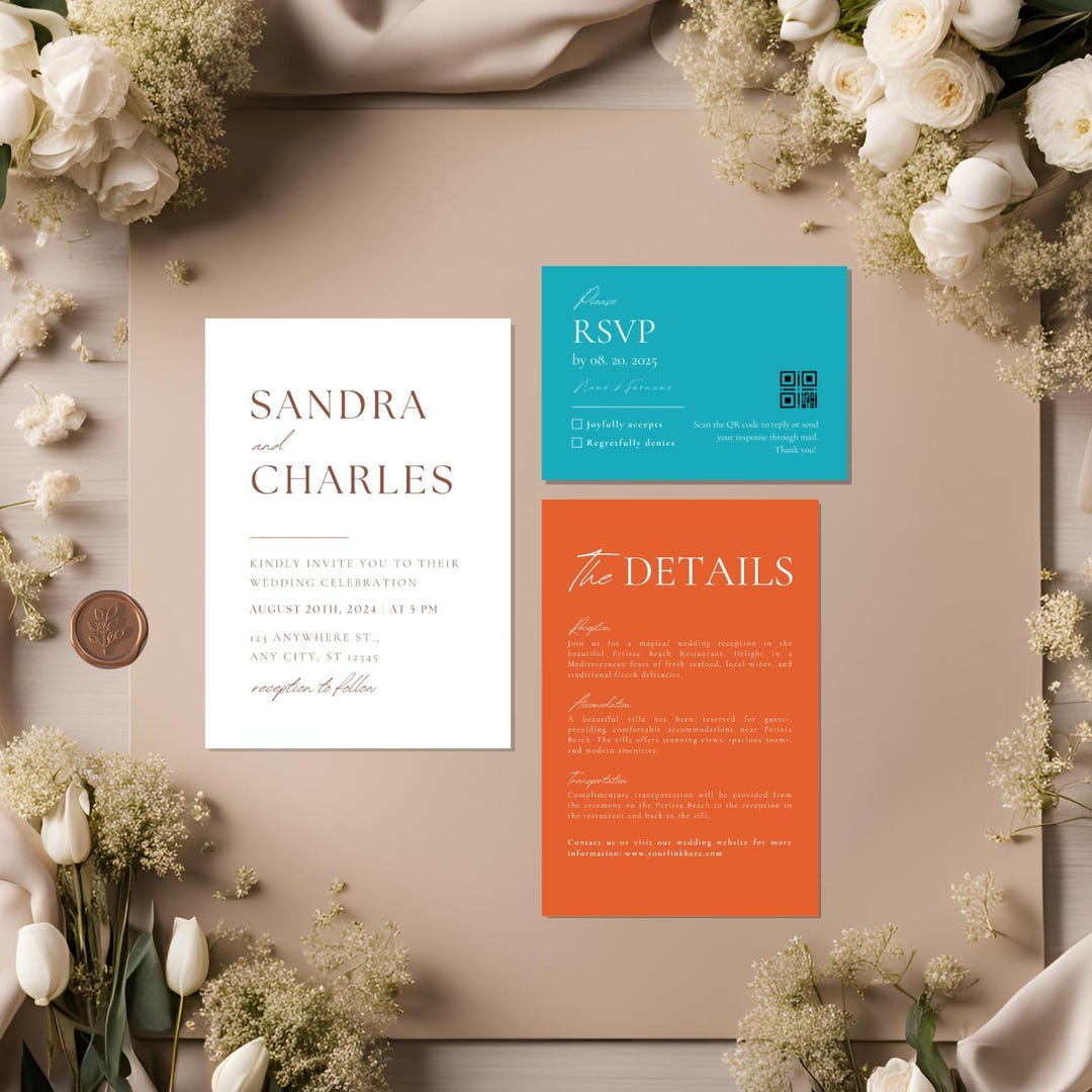 Modern Wedding Invitation Set Template, Colorful Invite QR Suite, Blue ...