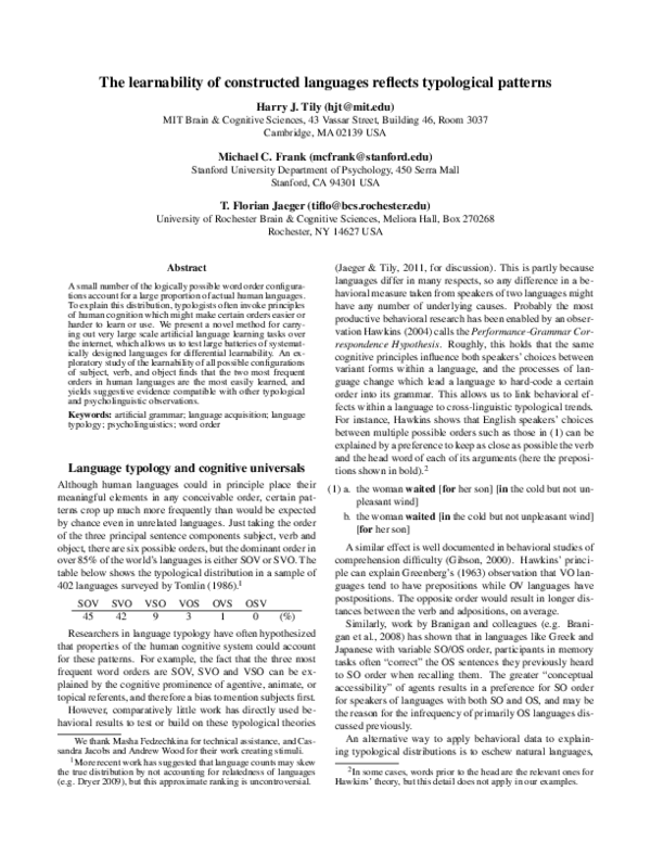 (PDF) The learnability of constructed languages reflects typological ...