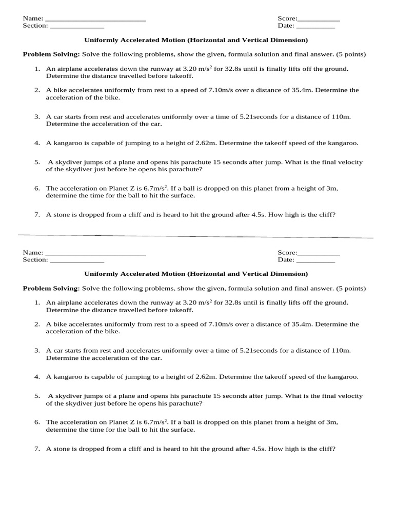 Uniformly Accelerated Motion Worksheet