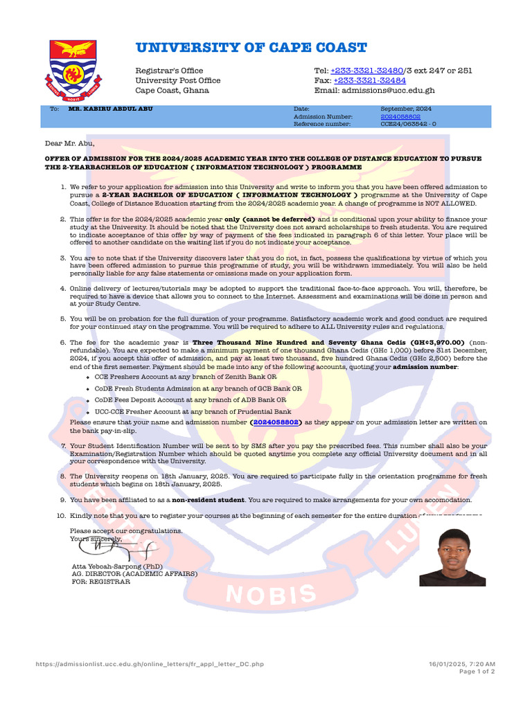 Admission Letter UCC | PDF