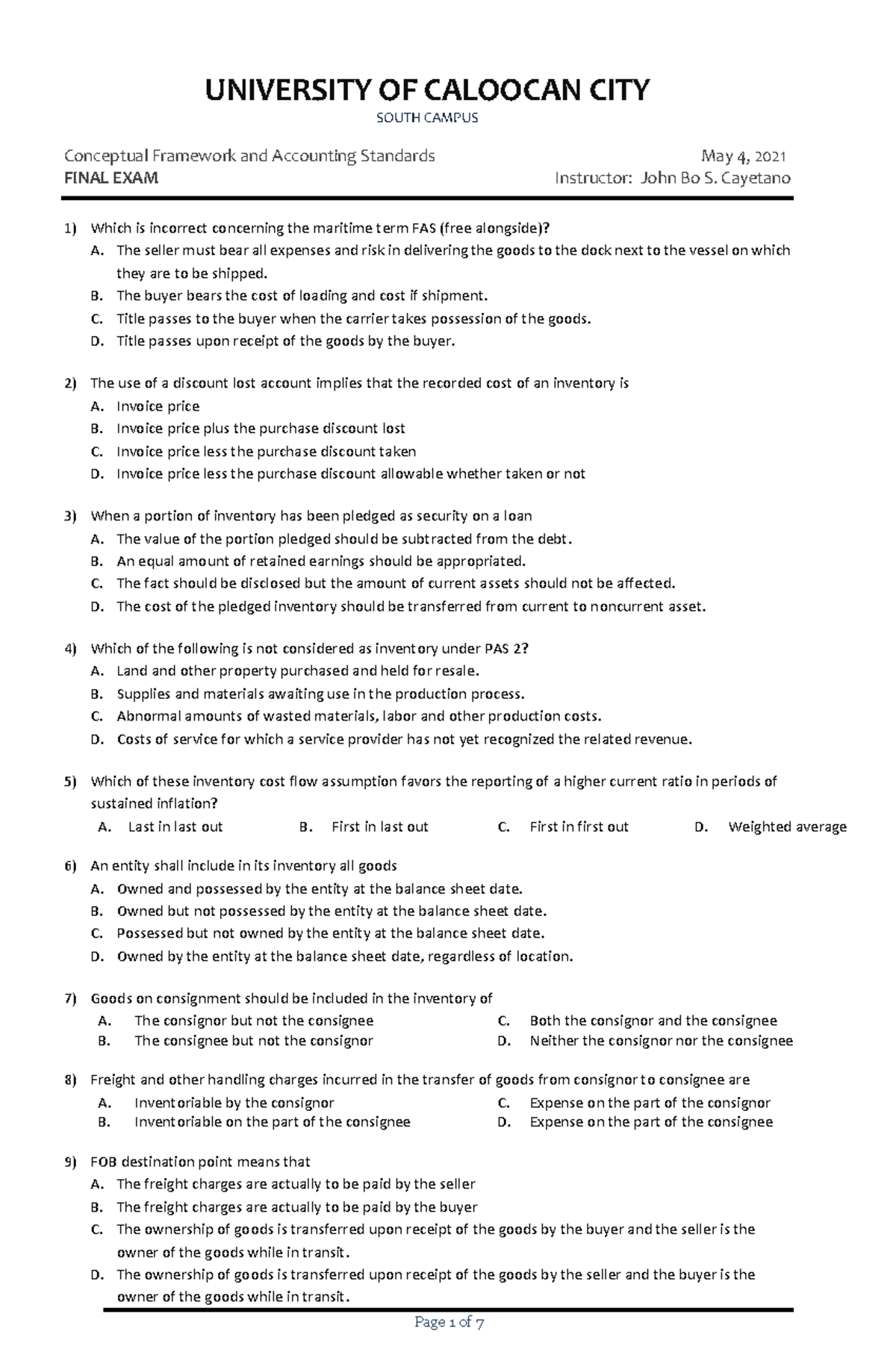 CFAS Finals QUIZ 01 UCC - notes - UNIVERSITY OF CALOOCAN CITY SOUTH ...