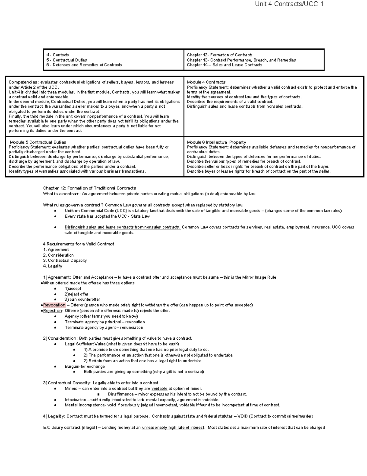 D216 Unit 4 Study Notes: Key Concepts in Contracts and UCC - Studocu