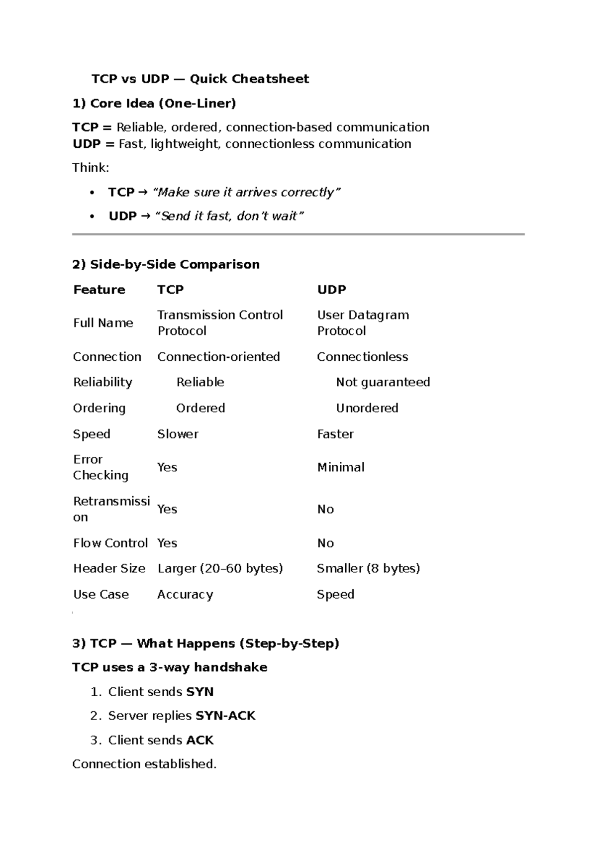 TCP vs UDP Comparison Cheatsheet for Quick Reference - Studocu