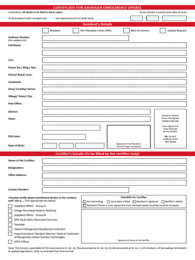 Certificate for Aadhaar Enrolment Update Form New Format & How to Fill ...