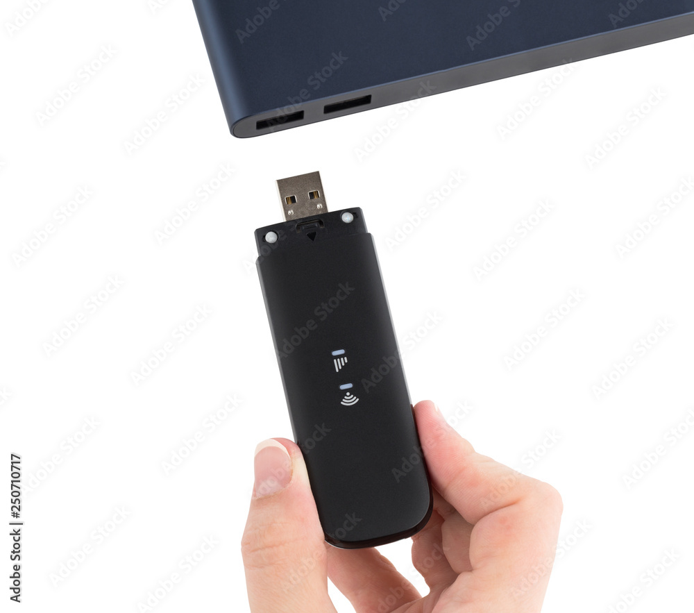 Portable usb modem and hand on a white background. Connect 4g / lte ...
