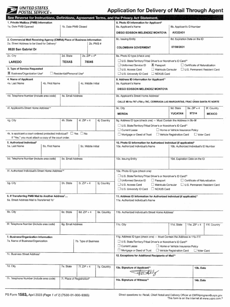 Download USPS Form 1583 | Application of Delivery of Mail Through an ...