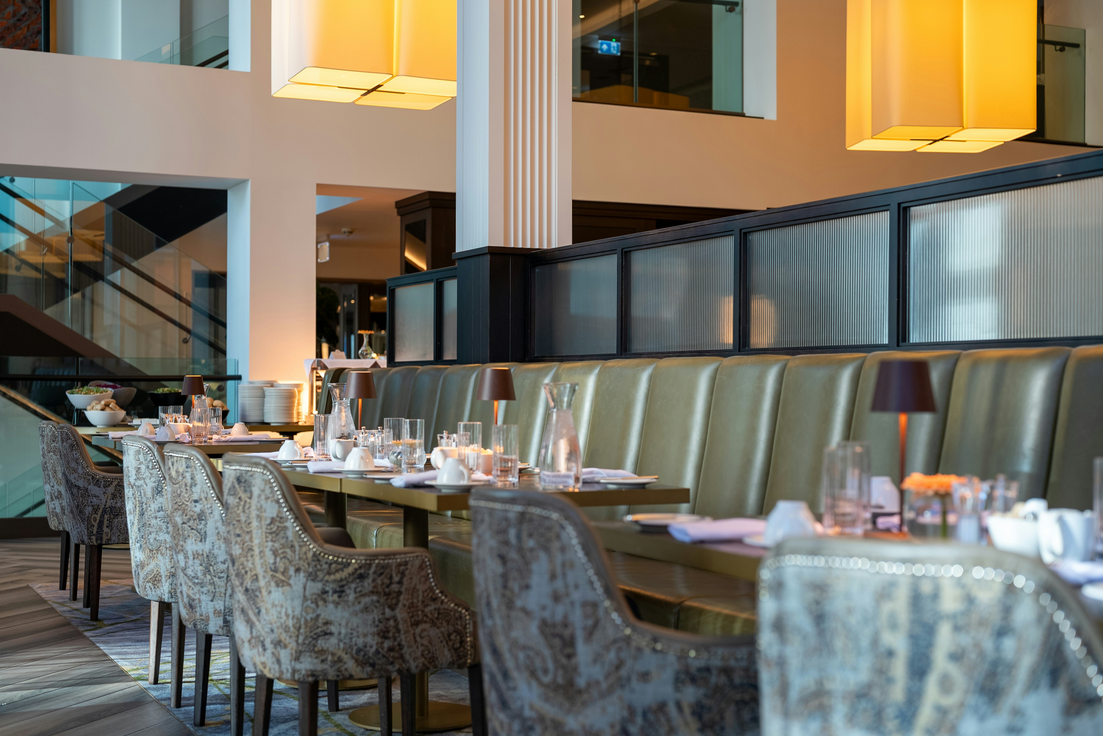Elegant restaurant dining area with set tables and plush seating. photo ...