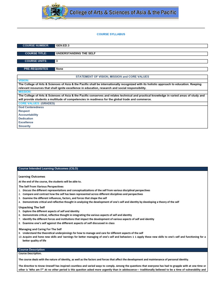 UTS Course Syllabus: Understanding Self | PDF | Self | Identity (Social ...