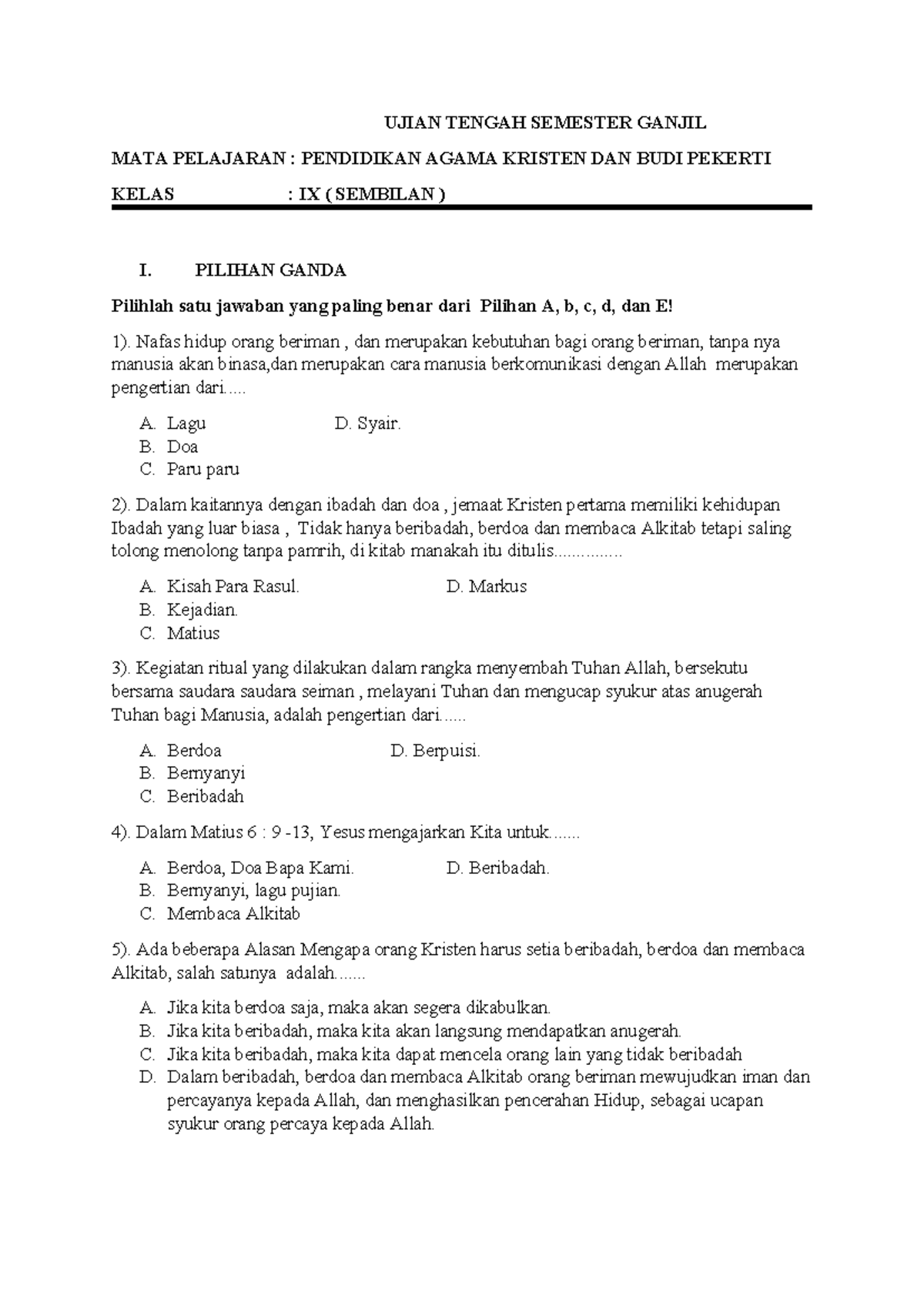 SOAL UTS PENDIDIKAN AGAMA KRISTEN KELAS IX: PILIHAN GANDA & URAIAN ...