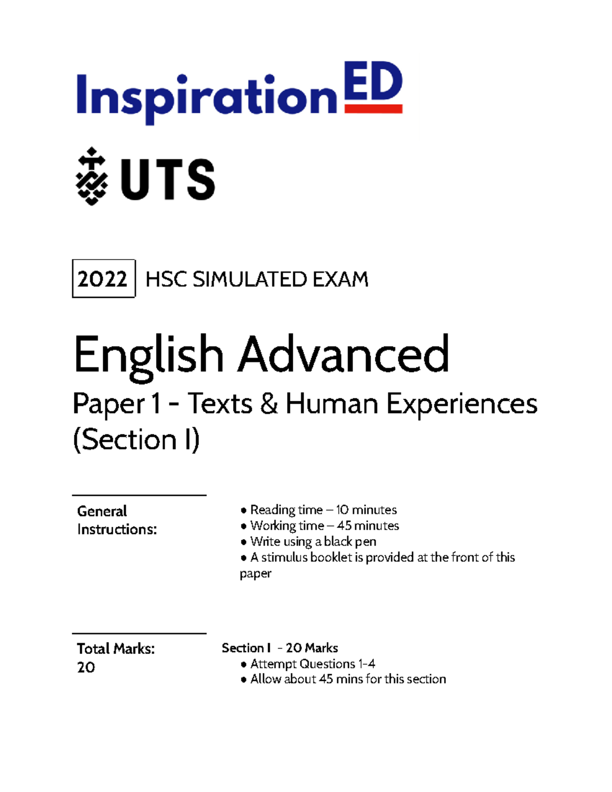 UTS English Advanced Paper 1: Human Experiences Exam 2022 - Studocu