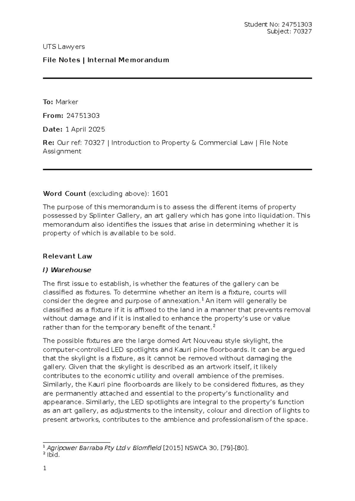 70327 UTS IPCL File Note Assessment on Splinter Gallery Assets - Studocu