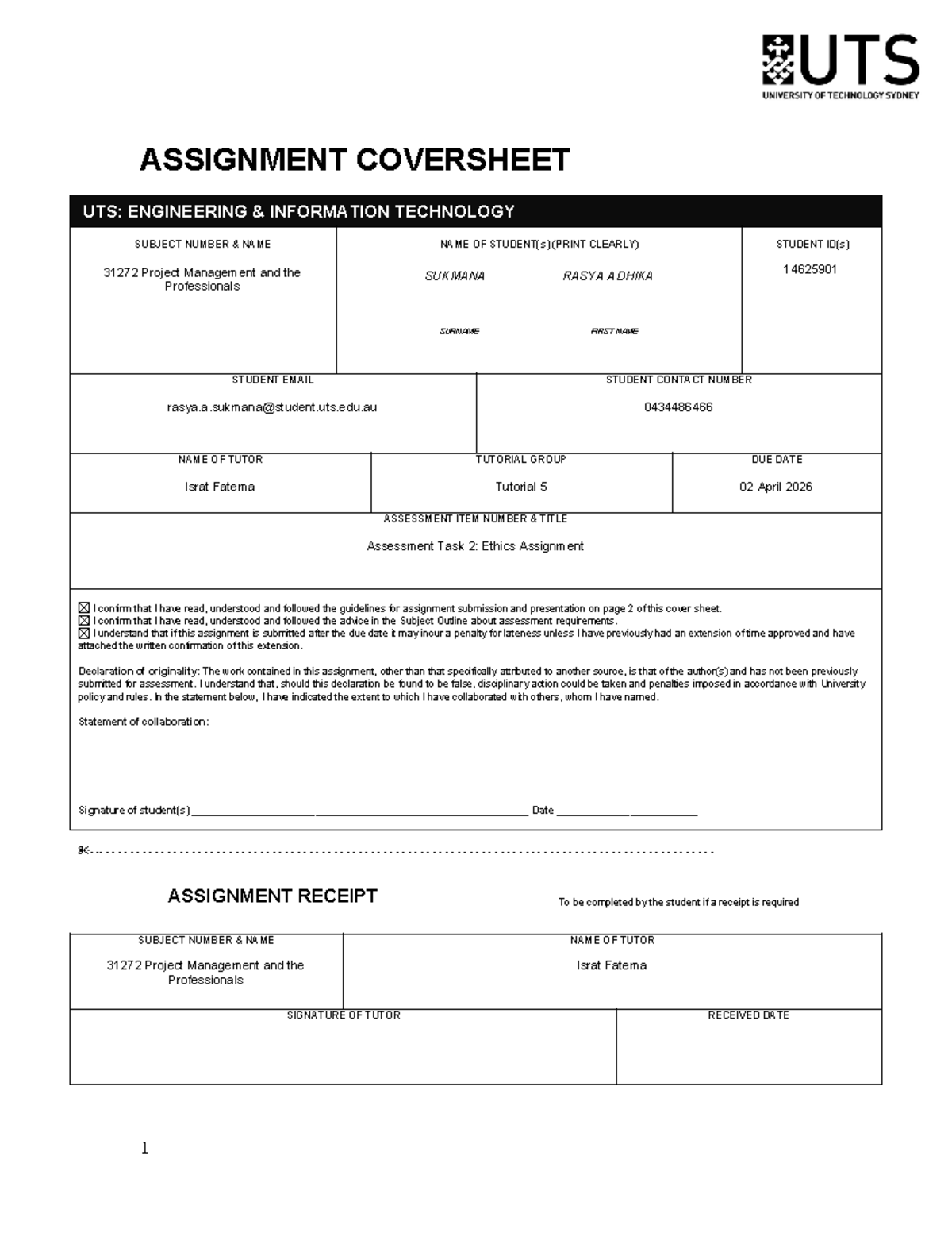 Ethics Assignment for UTS: 31272 Project Management and Professionals ...