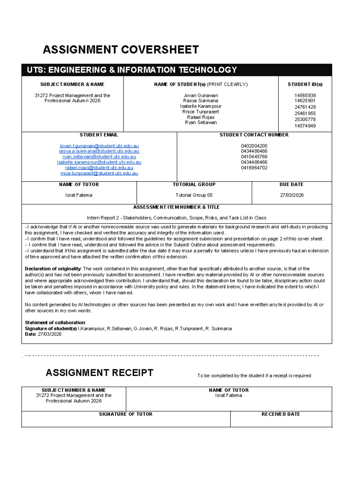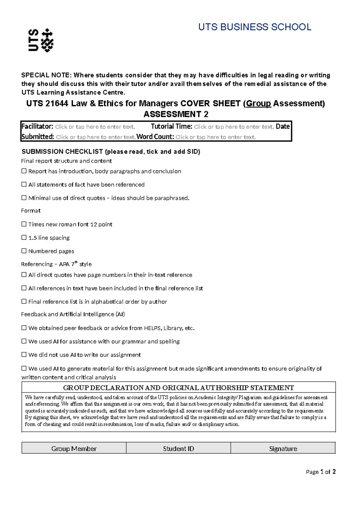 UTS 21644 Law Ethics for Managers Group Assessment Cover Sheet - Studocu