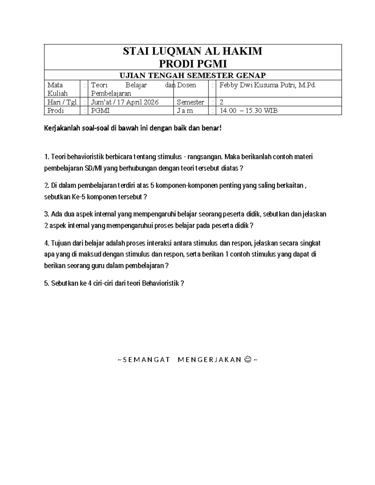 Soal UTS Teori Belajar dan Pembelajaran PGMI 2026 - Studocu