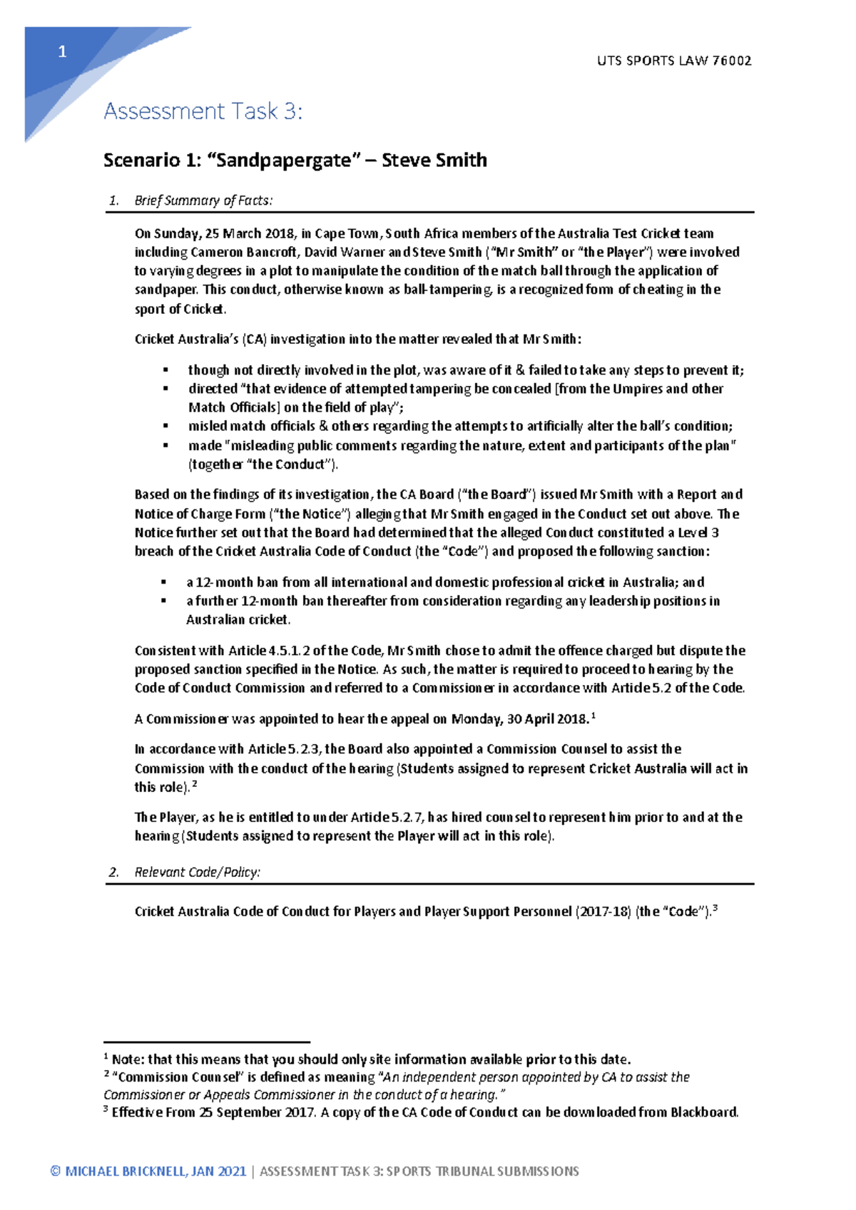 UTS SPORTS LAW 76002 Assessment Task 3: Mitigation Plea for Steve Smith ...