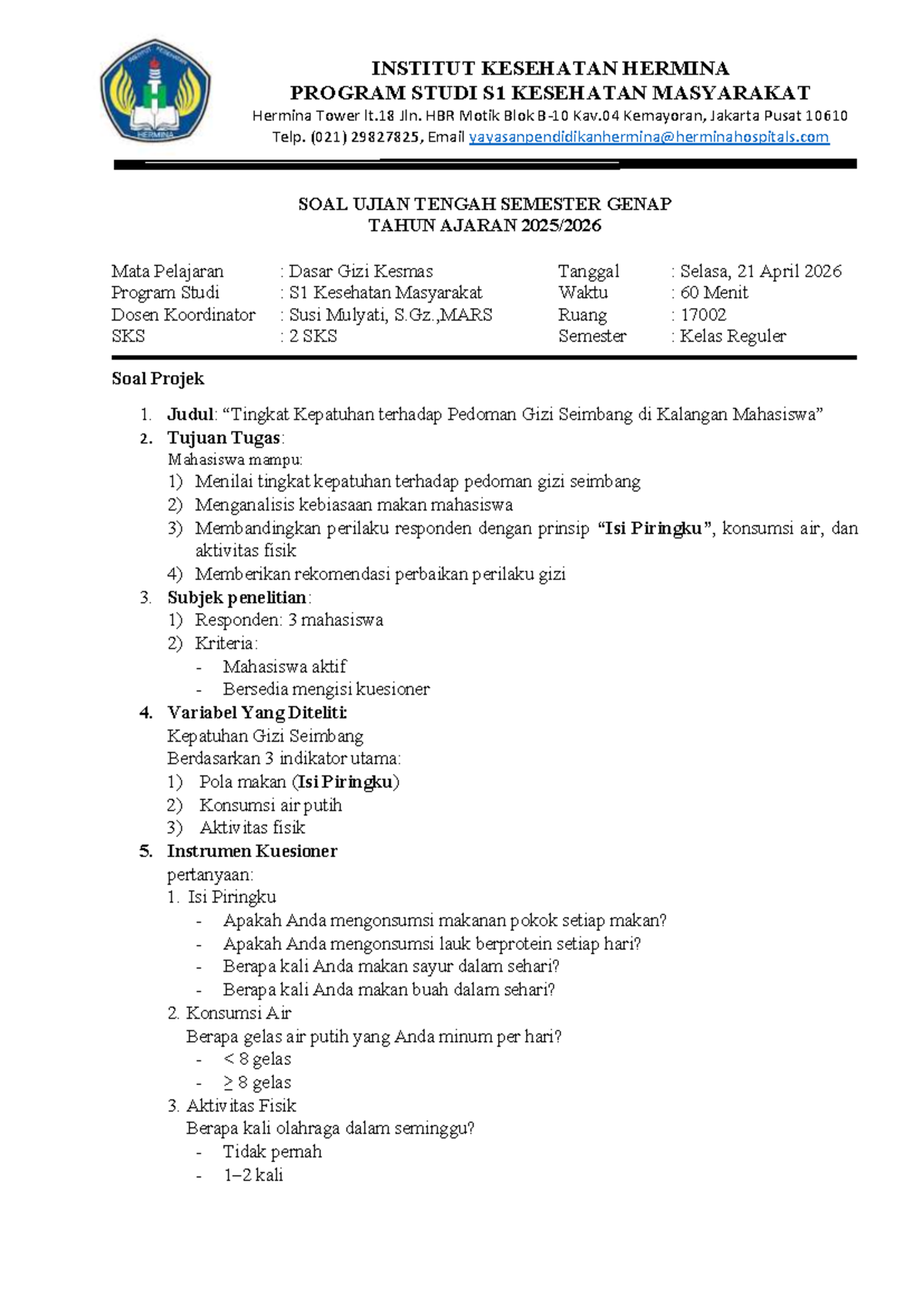 SOAL UTS Dasar Gizi Kesmas S1 Kesehatan Masyarakat Kelas Reguler - Studocu
