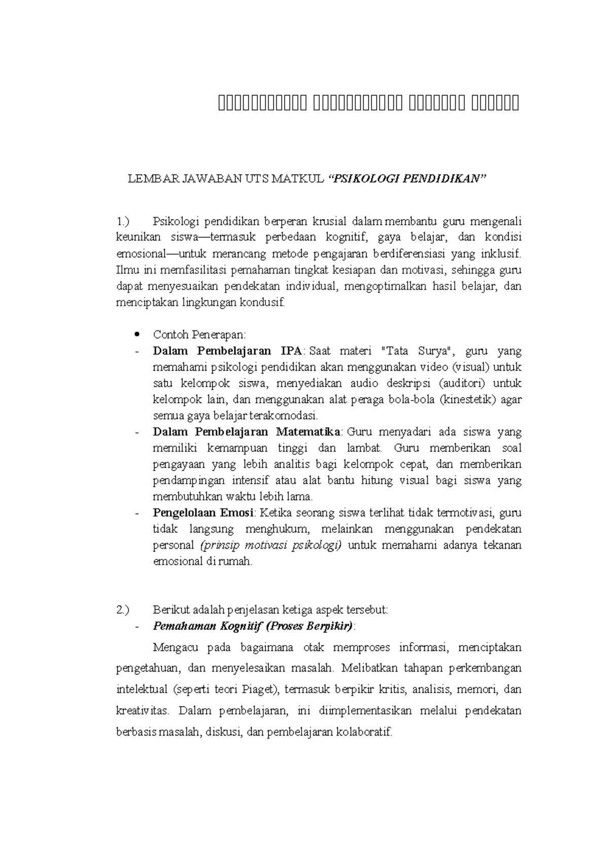 Jawaban UTS Psikologi Pendidikan (MATKUL: Psikologi Pendidikan) - Studocu