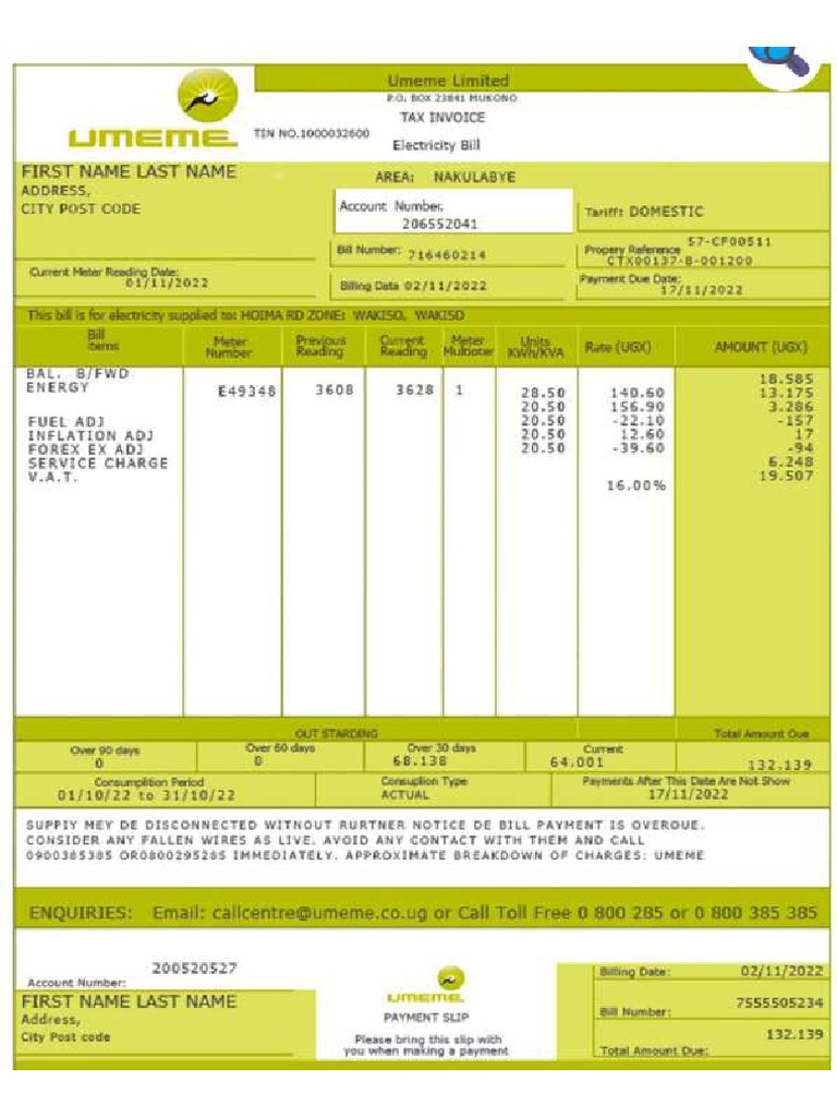 Uganda UMEME business utility bill Word and PDF template - Oxtempl