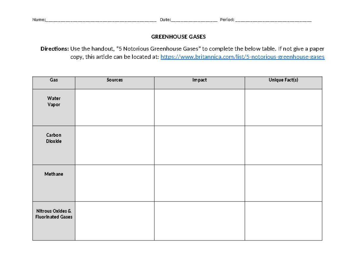 Greenhouse Gases Table - Name ...