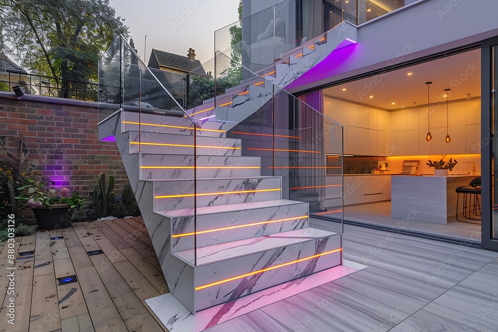 Premium AI Image | White marble L shape floating stairs led stripe ...