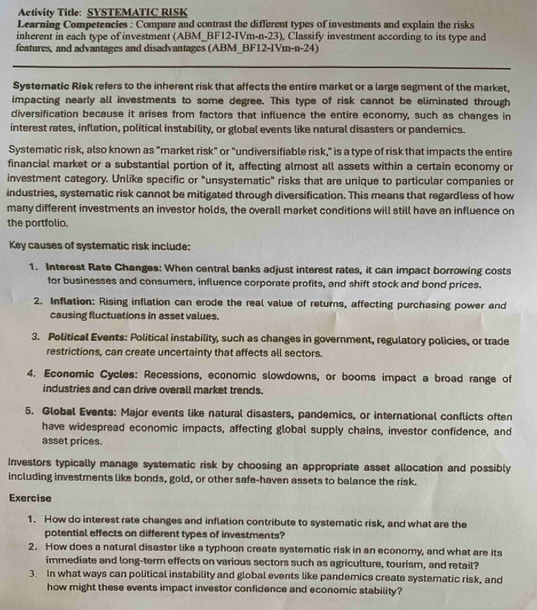 Solved: Activity Title: SYSTEMATIC RISK Learning Competencies : Compare ...
