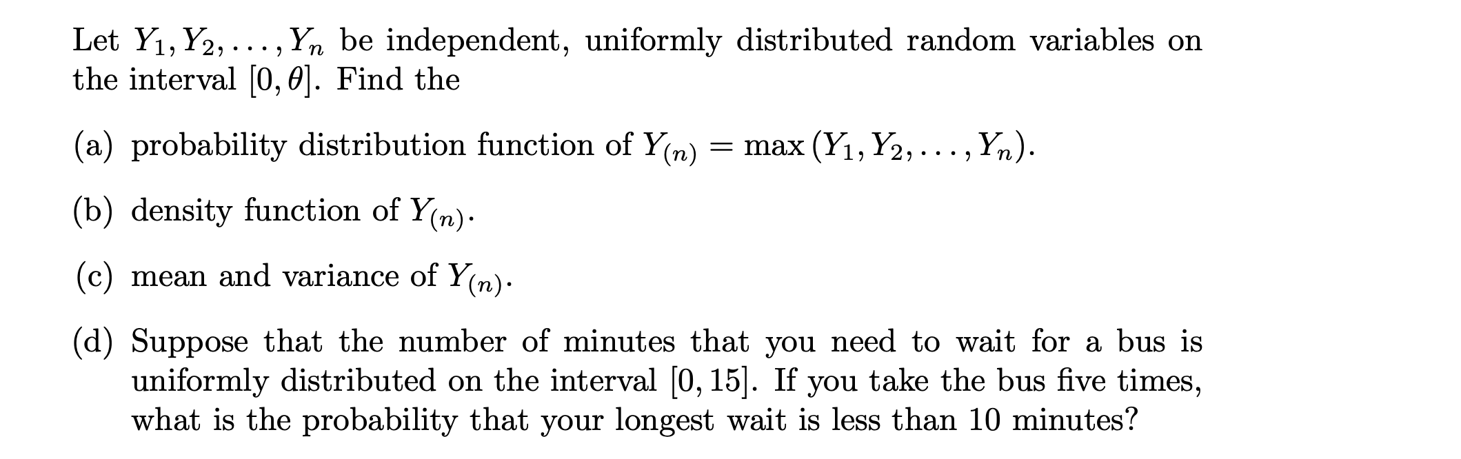 Solved Let Y1,Y2,…,Yn be independent, uniformly distributed | Chegg.com