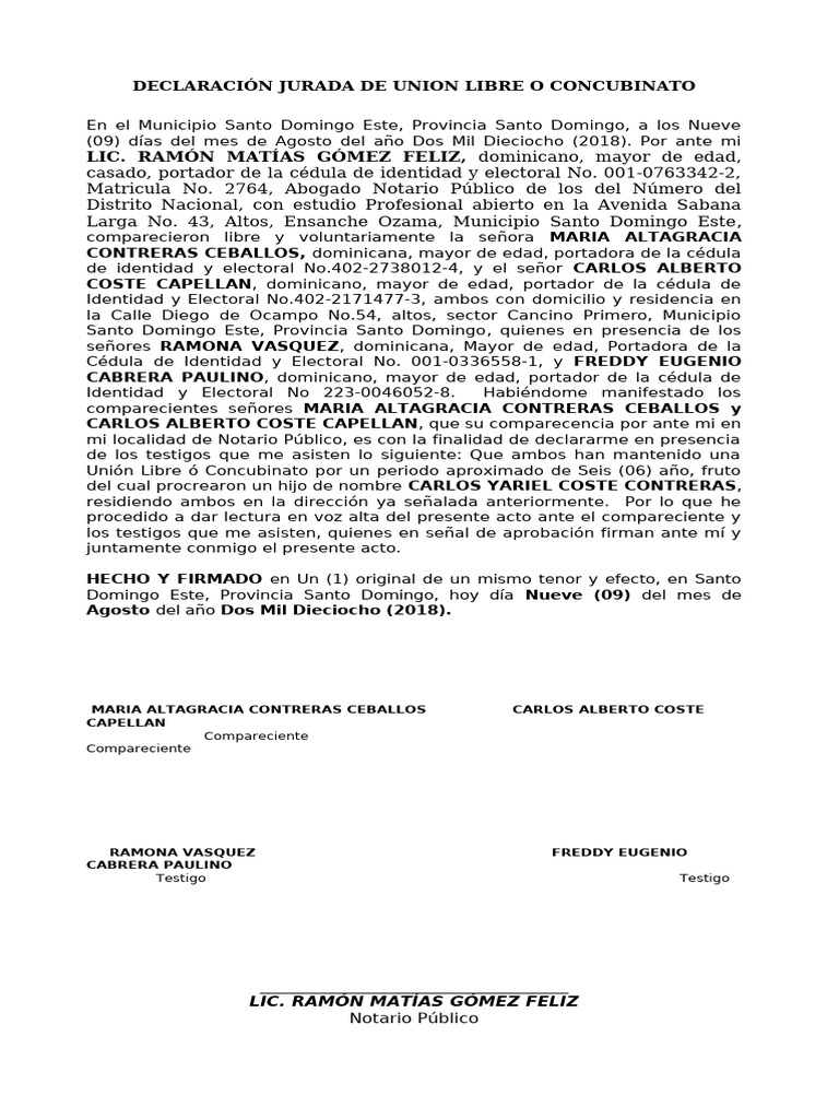 Declaración Jurada de Union Libre o Concubinato | PDF | República ...