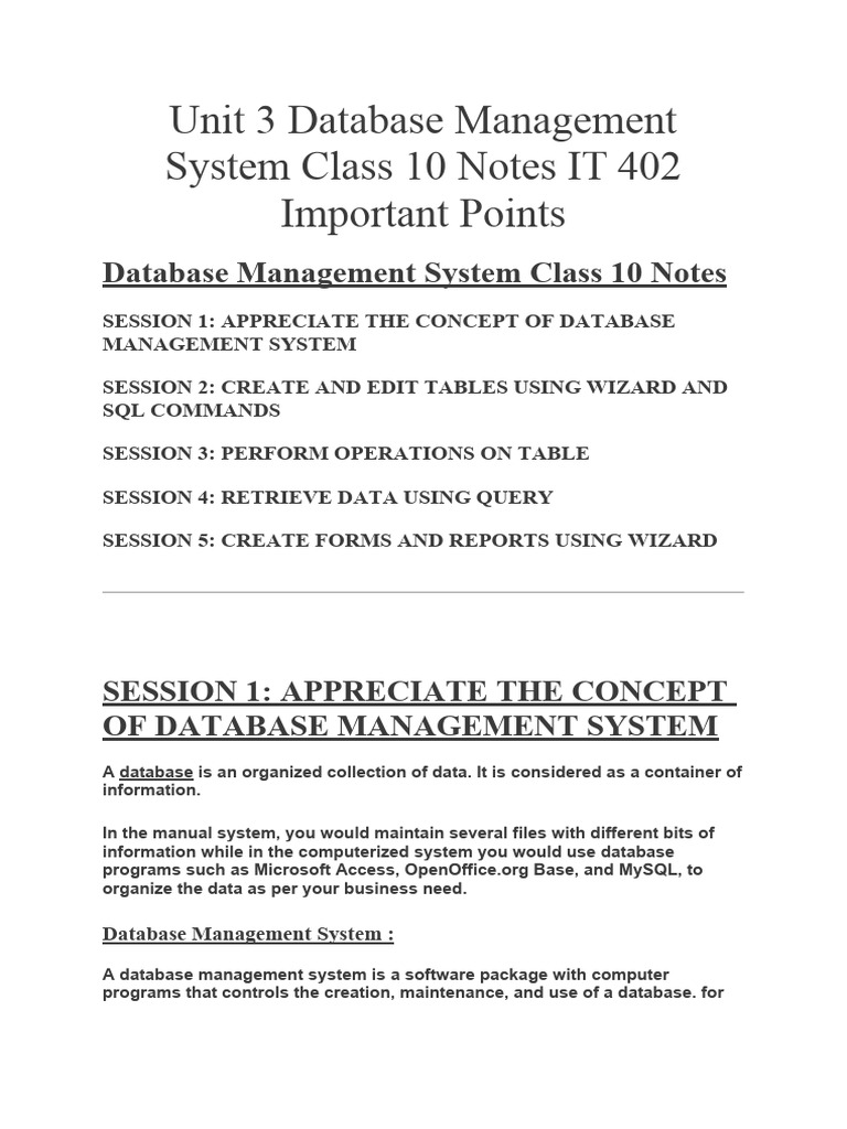 Class 10 DBMS Unit 3 Notes | PDF | Databases | Teaching Methods & Materials