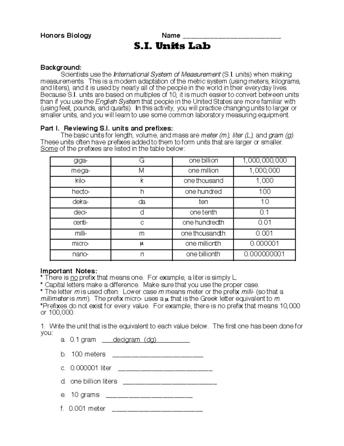 SI units lab - Honors Biology Name _________________________ S. Units ...