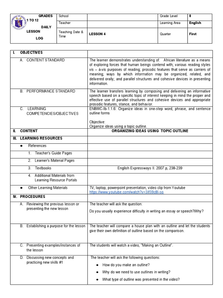Q1 Week 2 Lesson 4 Organizing Ideas Using Topic Outline | PDF ...