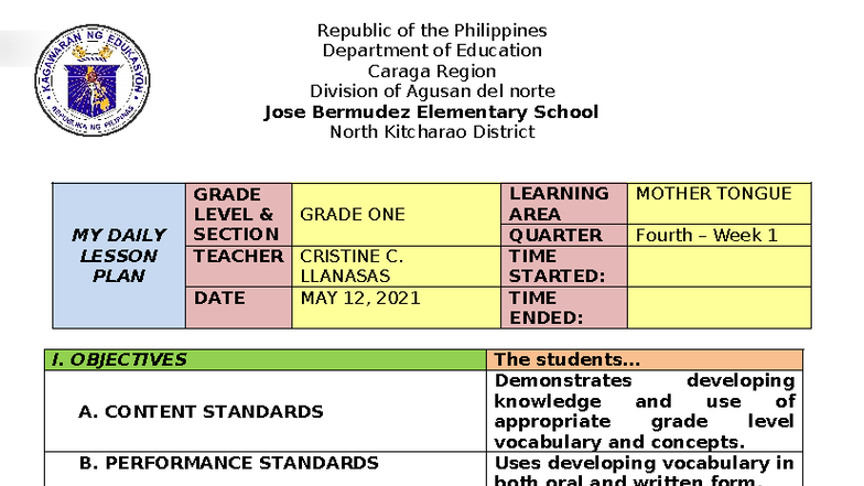 Daily Lesson Plan for Grade 1: Mother Tongue (COT.MTB) - Studocu