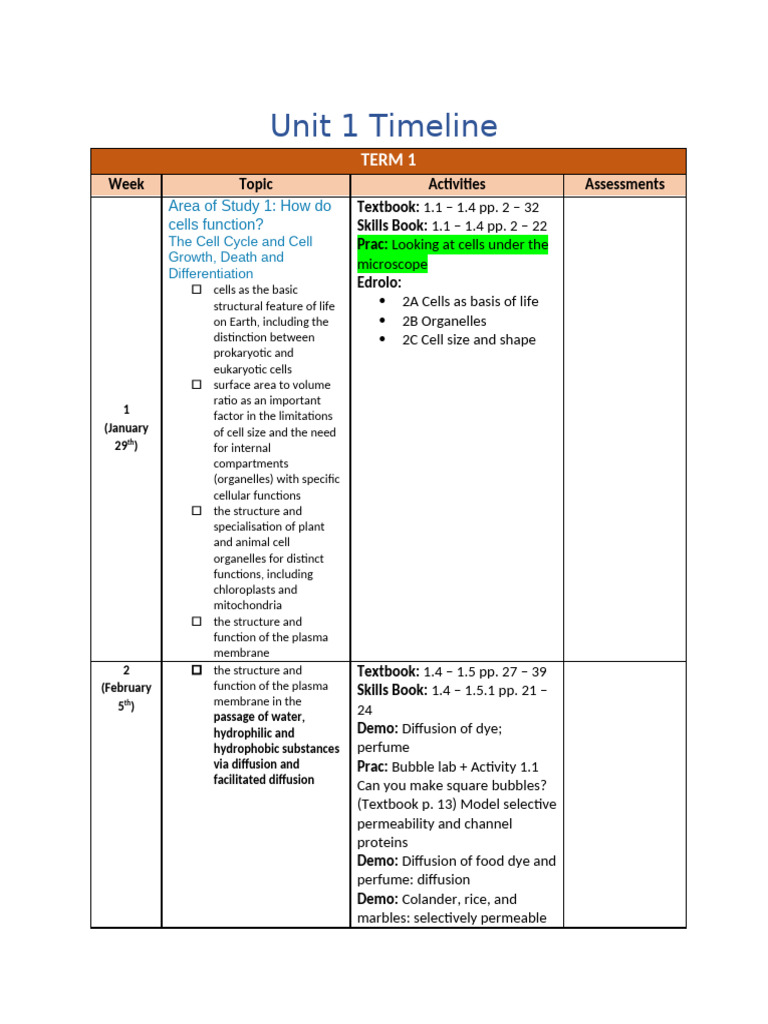 2024 Unit 1 Biology Timeline | PDF | Cell (Biology) | Cell Membrane