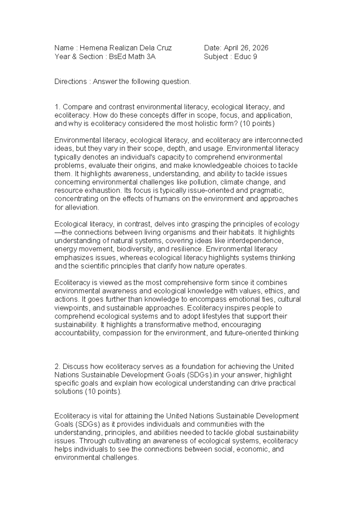EDUC 9: Ecoliteracy and Sustainable Development Insights - Studocu