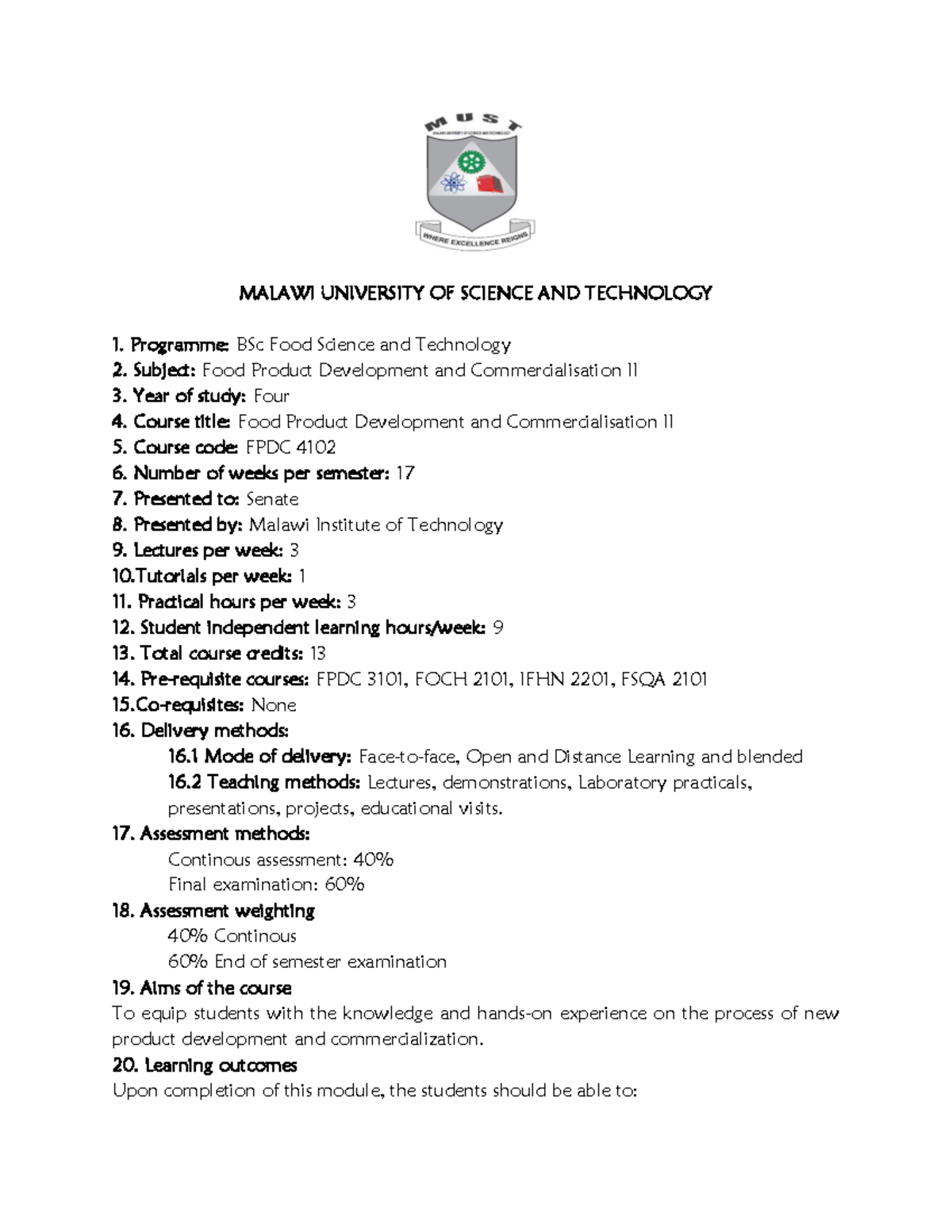 FPDC 4102 Food Product Development & Commercialisation Course Outline ...
