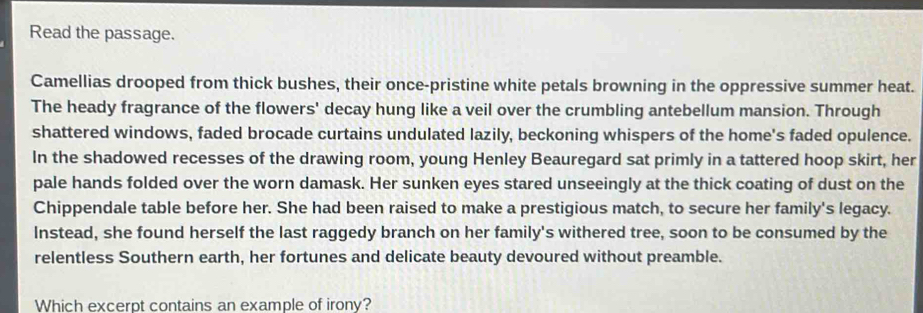 Solved: Read the passage. Camellias drooped from thick bushes, their ...