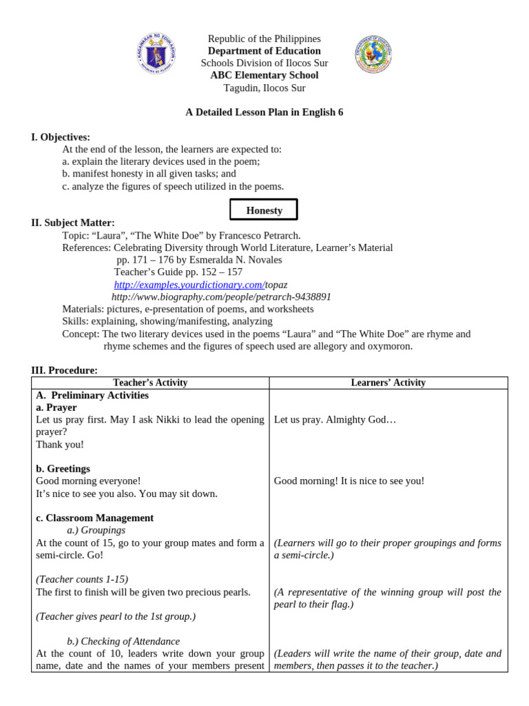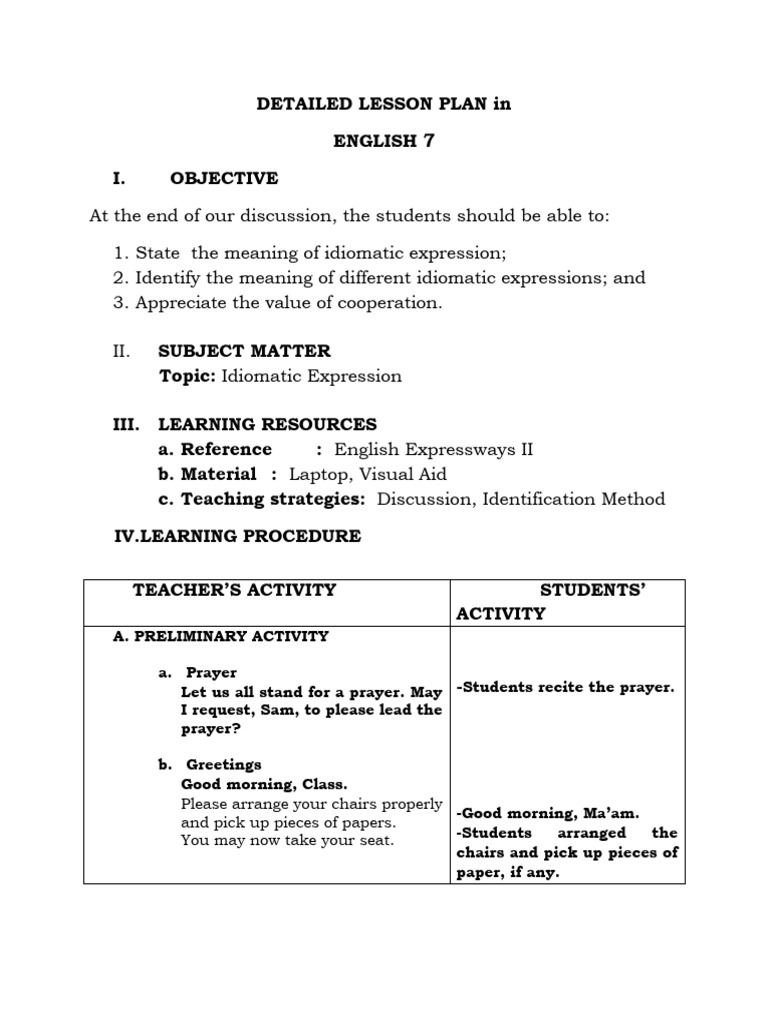 Sample Detailed Lesson Plan In English Deped - Free Printable Worksheet