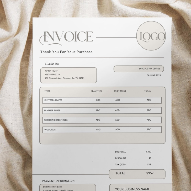 Invoice Template for Small Business – Minimalist Billing Form, Editable ...