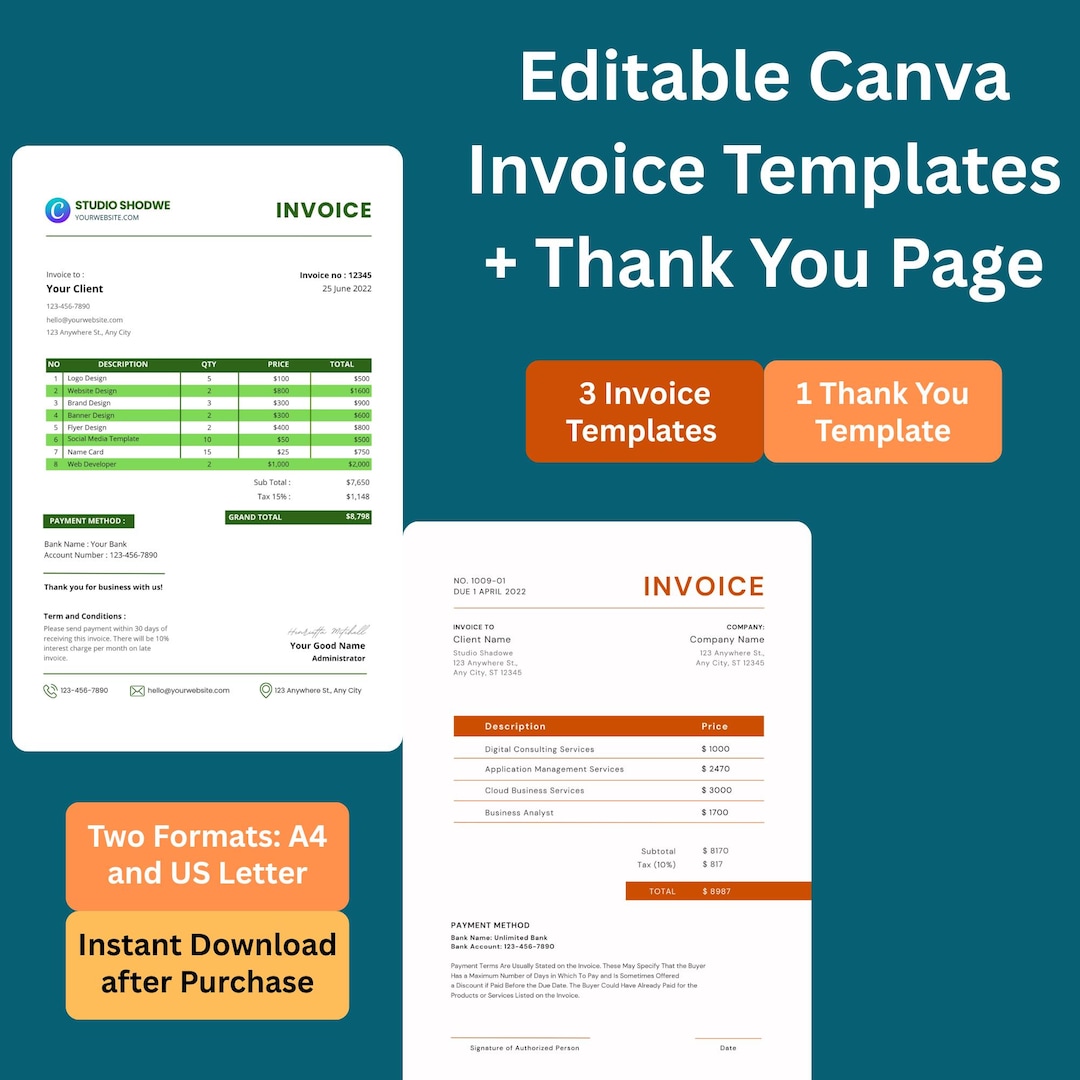 Custom Editable Canva Invoice Templates | Printable PDF Invoice ...