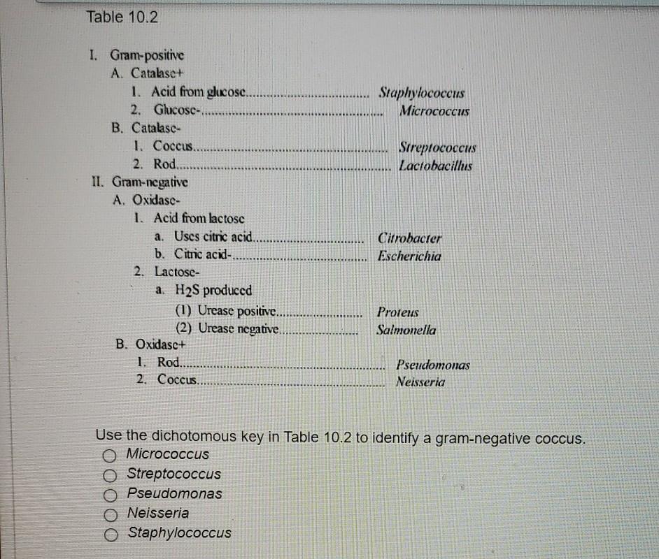 Solved Table 10.2 Staphylococcus Micrococcus Streptococcus | Chegg.com