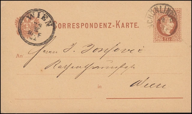 POSTCARD P 25 Franz-Joseph 2 Kreuzer from Schönlinde to Vienna 29.3.82 ...