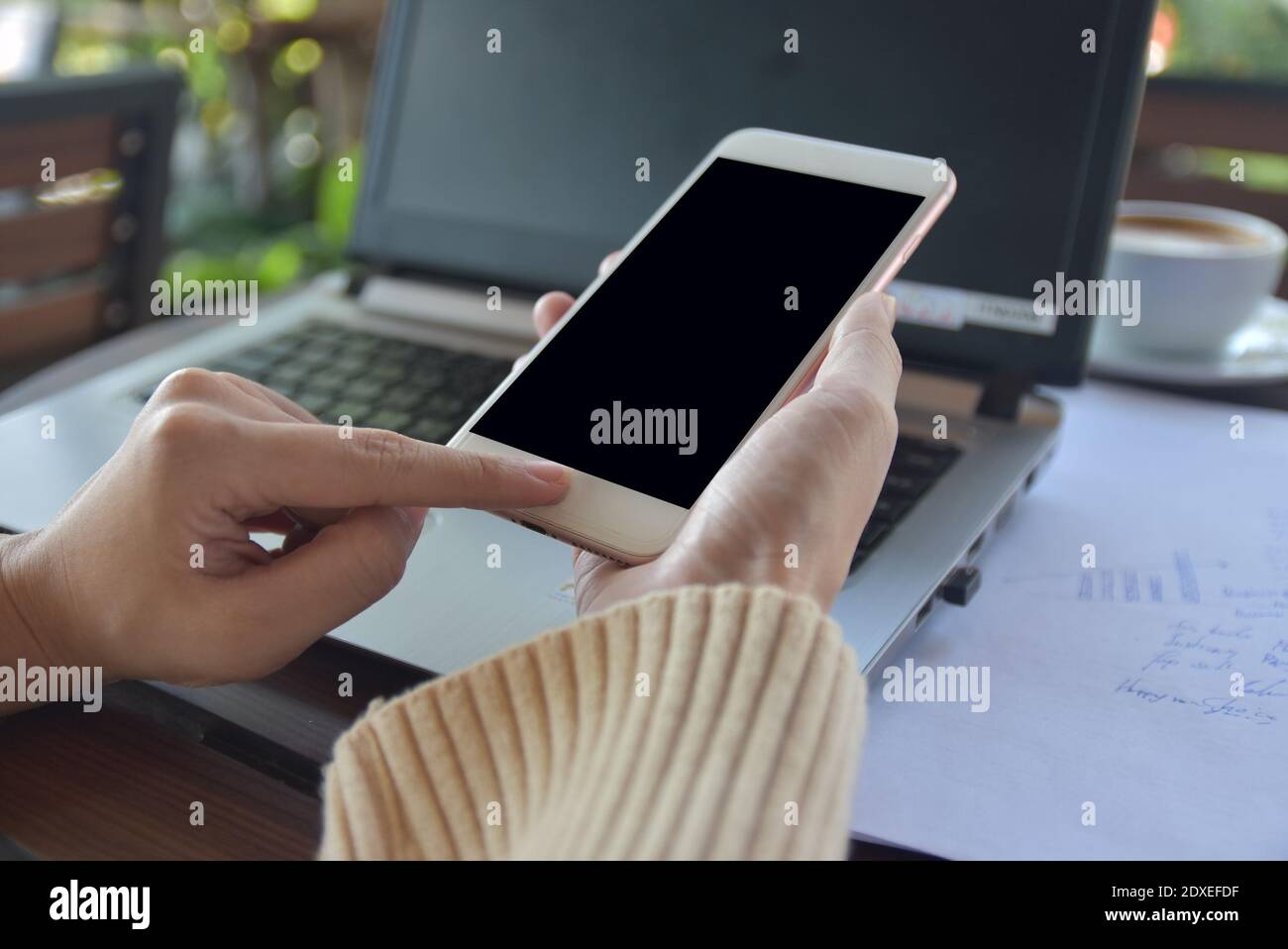 Woman use of mobile phone and laptop computer Stock Photo - Alamy