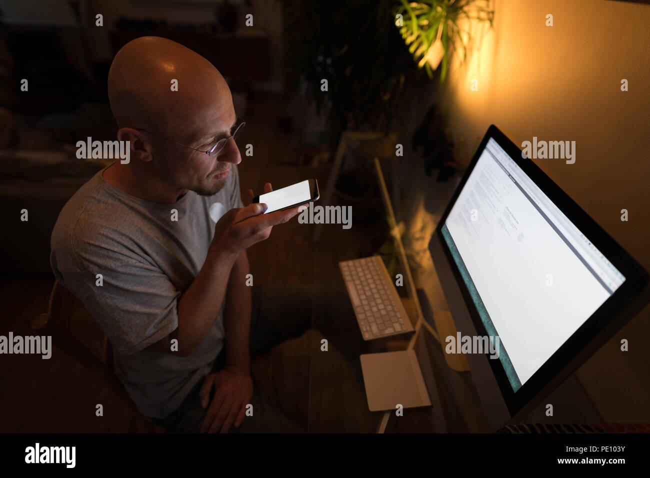Office worker using a computer and cell phone Stock Photo - Alamy