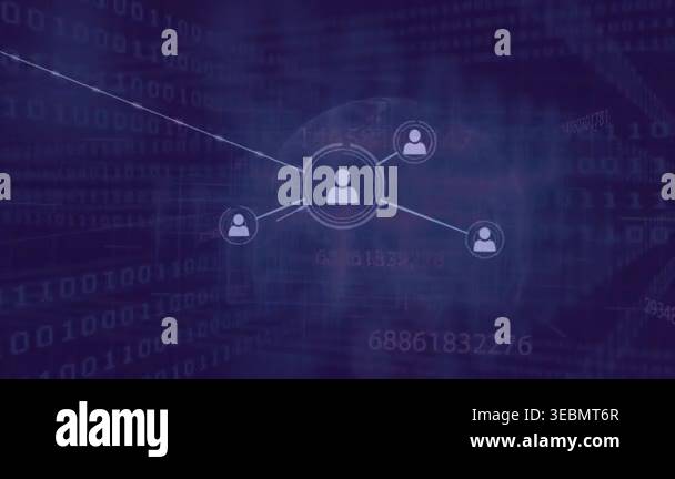 Animation of connected user icons over binary code and digital data ...