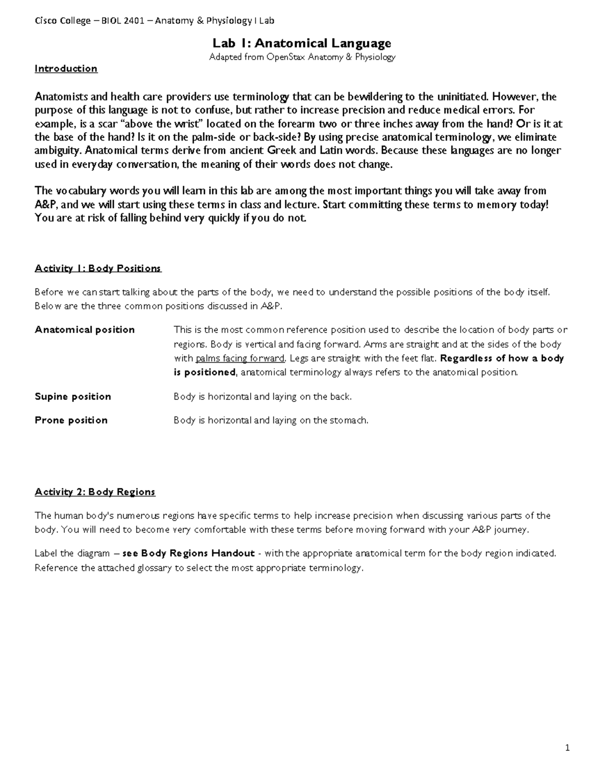 Lab 1 - Anatomical Language - Cisco College – BIOL 2401 – Anatomy ...
